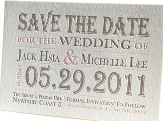 save the date in style! also available as a complete invitation suite. exquisitely letterpress printed, with a deep impression you can see and feel. sample shown in blossom pink + fog grey on pearl white.