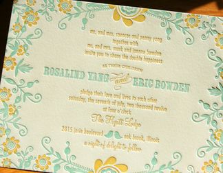sweet flowers! delicate flowers form a beautiful border around your personalized invitation wording. artisan letterpress printed, with a deep impression you can see and feel. additional coordinating stationery pieces available, including information cards, thank you cards, and more. sample shown: pool and curry on ecru.