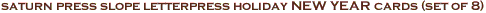 swoosh! pine tree branches frame a winter alpine scene. this beautiful holiday card is artisan letterpress printed on an antique letterpress, by hand, one card and colour at a time, on generously sized 5" x 7" folded creme textured cards. notable for the 1 deckle-edge on the cover. cover greeting: "Season's Greetings". inside greeting: "and a year of Peace and Happiness"